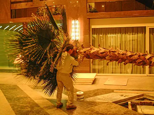 屋内用人工ヤシの木・H=10〜14m・14本の制作工程及び設置。